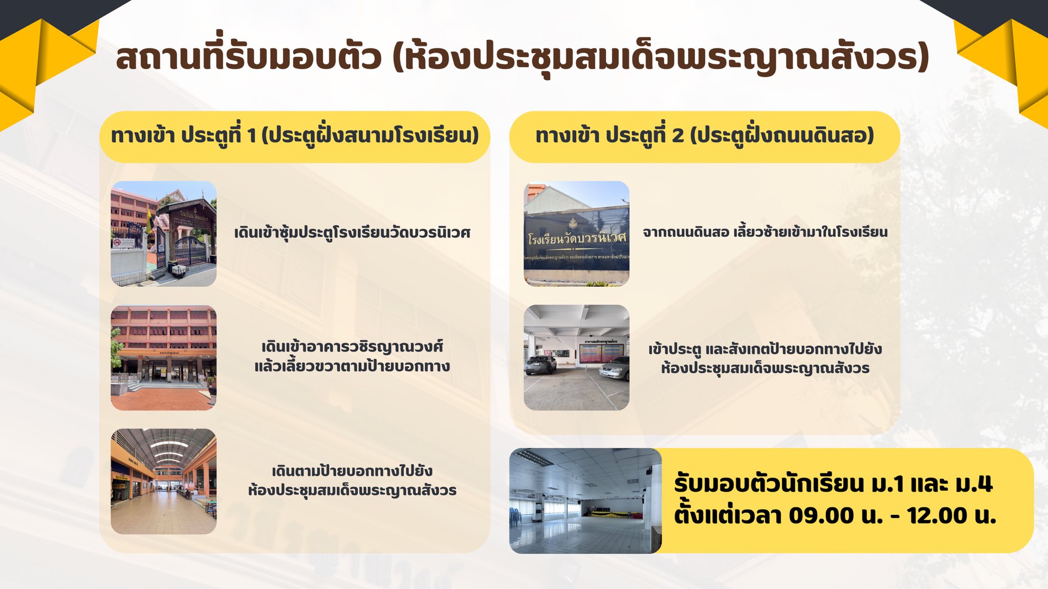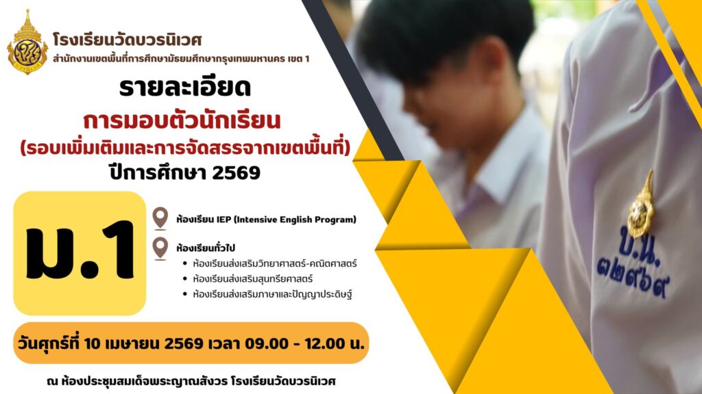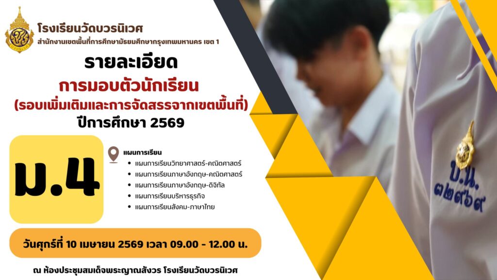 ในการนี้ โรงเรียนวัดบวรนิเวศ จึงประกาศรายชื่อผู้มีสิทธิ์เข้าศึกษา ชั้นมัธยมศึกษาปีที่ 1 และ ชั้นมัธยมศึกษาปีที่ 4 ปีการศึกษา 2569 ตามรายชื่อแนบท้ายประกาศ โดยให้มามอบตัว ในวันศุกร์ที่ 10 เมษายน 2569 เวลา 09.00 –12.00 น. ณ ห้องประชุมสมเด็จพระญาณสังวร ทั้งนี้ ให้ผู้มีสิทธิ์เข้าศึกษา จัดเตรียมเอกสาร ตามรายละเอียดแนบท้ายประกาศนี้ รายละเอียดปรากฏตามประกาศที่แนบ