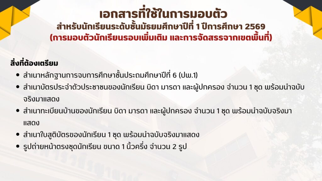 ตามประกาศ สำนักงานเขตพื้นที่การศึกษามัธยมศึกษากรุงเทพมหานครเขต 1 เรื่องการจัดหาที่เรียน ให้แก่นักเรียนที่ยังไม่มีที่เรียนปีการศึกษา 2569 ชั้นมัธยมศึกษาปีที่ 1 และชั้นมัธยมศึกษาปีที่ 4 ลงวันที่ 7 เมษายน2569 ความแจ้งแล้วนั้น