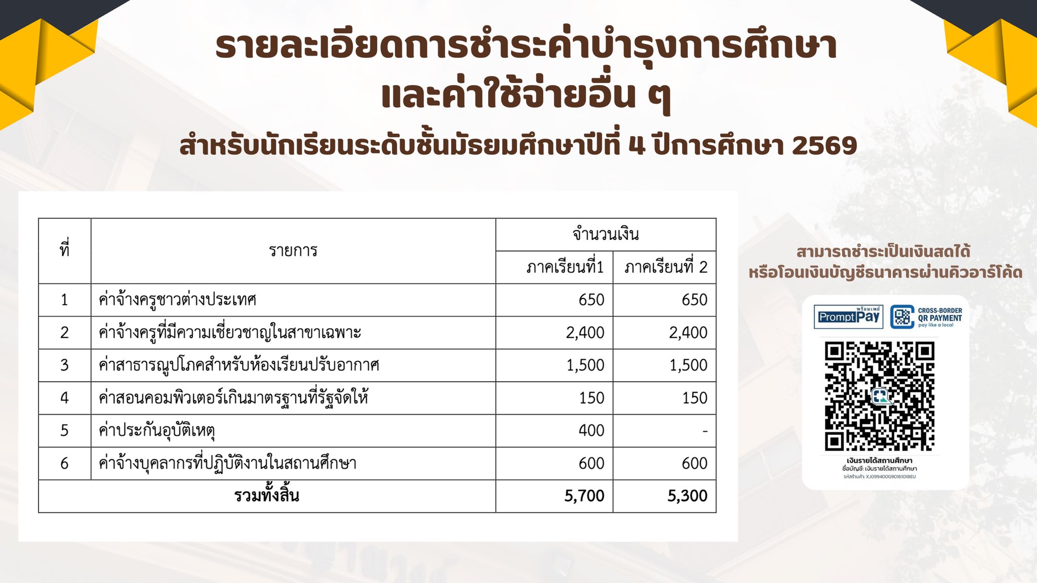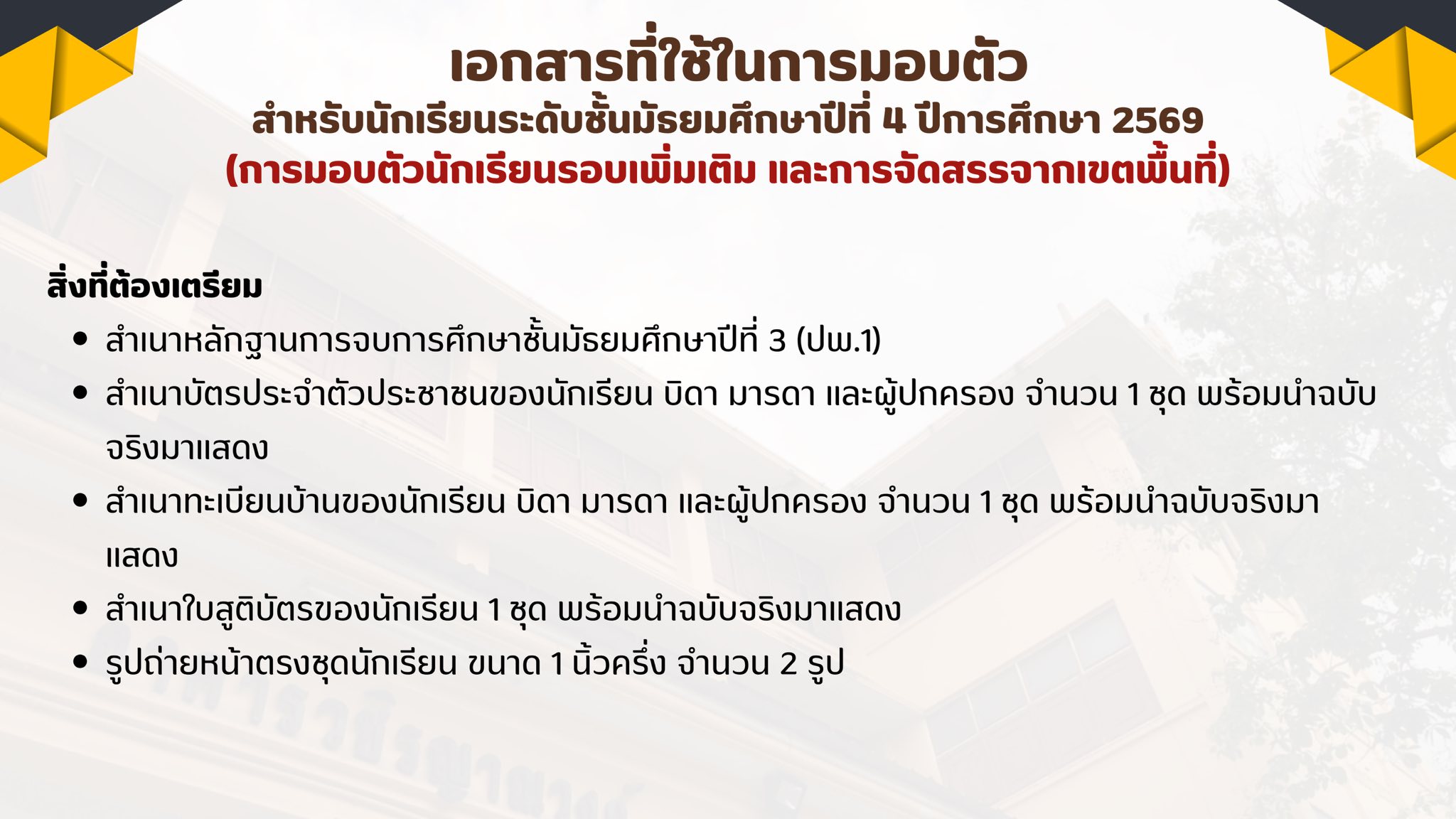 เรื่อง ประกาศรายชื่อผู้มีสิทธิ์เข้าศึกษาชั้นมัธยมศึกษาปีที่ 1 และชั้นมัธยมศึกษาปีที่ 4 ปีการศึกษา 2569 ที่ได้รับการจัดหาที่เรียนจากสํานักงานเขตพื้นที่